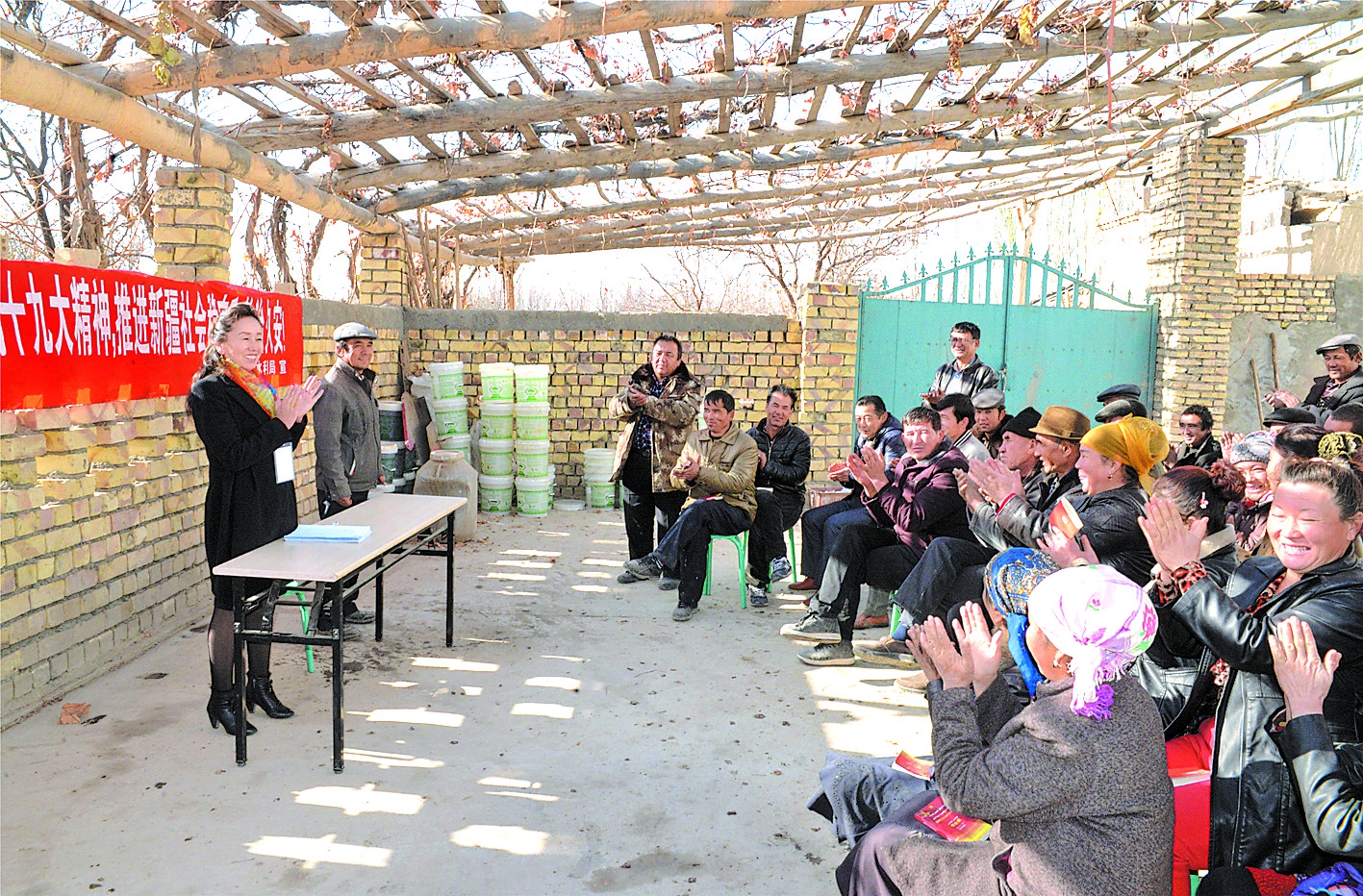 “大家知不知道十九大提出的到哪一年实现全面建成小康社会?请踊跃发言谈谈你认为的小康社会……”11月21日,轮台县水利局驻轮台县群巴克镇迪那尔村“访惠聚”工作队队员、草根宣讲员阿依努尔·吾布力在村民吐地·阿不都依木的庭院里向村民宣讲党的十九大精神。老党员居买克·尼亚吾东回答说:“党的十九大提出到2020年全面建成小康社会,第二轮土地承包到期后再延长三十年。现在党的政策特别好,我们一定要感党恩、听党话、跟党走。”