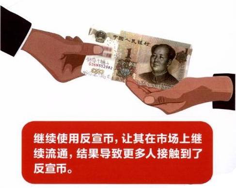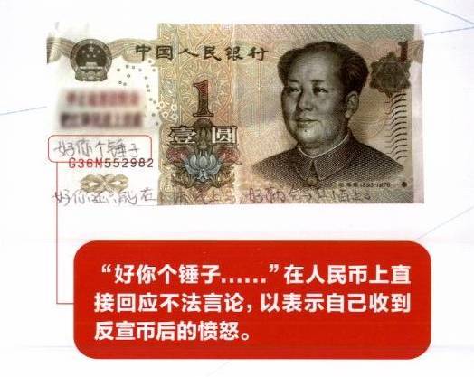 不法组织、不法分子以人民币为载体,在上面印刷不法口号,从而达到不法宣传的目的。这些印有不发内容的人民币就叫反宣币。 2种常见的错误处理姿势!! (1)以其人之道还其人之身